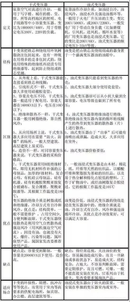 油浸式变压器依靠油作冷却介质、如油浸自冷、油浸风冷、油浸水冷、强迫油循环等。干式变压器依靠空气对流进行自然冷却或增加风机冷却,多用于高层建筑、高速收费站点用电及局部照明、电子线路等小容量变压器。