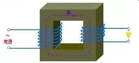 铁心的作用是加强两个线圈间的磁耦合。为了减少铁内涡流和磁滞损耗,铁心由涂漆的硅钢片叠压而成;两个线圈之间没有电的联系,线圈由绝缘铜线(或铝线)绕成。一个线圈接交流电源称为初级线圈(或原线圈),另一个线圈接用电器称为次级线圈(或副线圈)。实际的变压器是很复杂的,不可避免地存在铜损(线圈电阻发热)、铁损(铁心发热)和漏磁(经空气闭合的磁感应线)等,为了简化讨论这里只介绍理想变压器。理想变压器成立的条件是:忽略漏磁通,忽略原、副线圈的电阻,忽略铁心的损耗,忽略空载电流(副线圈开路原线圈线圈中的电流)。例如电力变压器在满载运行时(副线圈输出额定功率)即接近理想变压器情况。