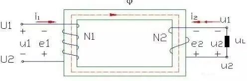 变压器是利用电磁感应原理制成的静止用电器。当变压器的原线圈接在交流电源上时,铁心中便产生交变磁通,交变磁通用φ表示。原、副线圈中的φ是相同的,φ也是简谐函数,表为φ=φmsinωt。由法拉第电磁感应定律可知,原、副线圈中的感应电动势为e1=-N1dφ/dt、e2=-N2dφ/dt。式中N1、N2为原、副线圈的匝数。由图可知U1=-e1,U2=e2(原线圈物理量用下角标1表示,副线圈物理量用下角标2表示),其复有效值为U1=-E1=jN1ωΦ、U2=E2=-jN2ωΦ,令k=N1/N2,称变压器的变比。由上式可得U1/ U2=-N1/N2=-k,即变压器原、副线圈电压有效值之比,等于其匝数比而且原、副线圈电压的位相差为π。
