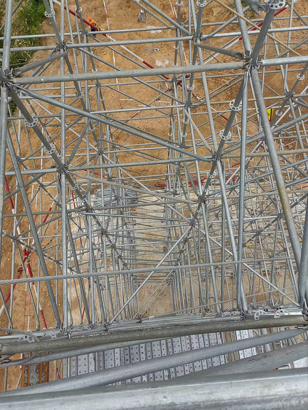 铁路两侧跨越架搭设前,确定施工占地范围,并用白灰标记出来,搭设跨越架需要与当地政府沟通好,跨越架搭设前用液压挖掘机(SY365H-S)平整场地,将设置跨越架处的树木、杂草等进行清理,将跨越架搭设处地表松土清理并平整,保证基础平整度偏差不超过2cm,保证地面无塌陷。场地平整完毕后用液压夯实机(LG-42KJ)进行夯实,并进行静力触探试验来检测地基土承载力,由当地具有相应检测资质的检测单位进行跨越架基础承载力检测(采用轻型动态触探仪),并出具相应检测报告。夯实后地基土承载力大于120kPa 判断合格,地面平整夯实应超出跨越架架体四周各3m,平整夯实后,对于平整完毕的场地采用水准仪进行复测,要求地面水平在±5°,严格控制标高,经监理验收,确认合格后方可进行下一步工序。为确保无沉降,在平整地面基础上面采用C25 混凝土制作跨越架垫层,铁路东侧跨越架垫层尺寸:顺铁路方向长18.4m,宽16.6m,厚200mm;铁路西侧跨越架垫层尺寸:顺铁路方向长18.4m,宽18.4m,厚200mm。在距离跨越架基础1 米处,围绕跨越架四周挖排水沟,排水沟沟底宽300mm,深300mm,边坡坡度1:1.5,并保证排水沟具有一定坡度,排水沟通过软管与既有排水设施连接,保证施工期间跨越架基础无积水浸泡现场。
