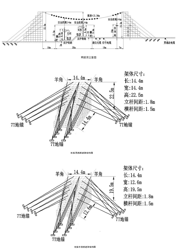 铁路东侧跨越架尺寸:14.4m(长)×12.6m(宽)×19.5m(高);铁路西侧跨越架尺寸:14.4m(长)×14.4m(宽)×22.5m(高),封网由5根φ16迪尼玛绳作为承力索,由5 根φ12 迪尼玛绳作为拉网绳,铁路上方按照每排间隔2m的搭设方式进行封网,则本次铁路上方封网共需15m 绝缘杆19 排,自闭线上方按照每排间隔2m的搭设方式进行封网,则本次自闭线上方封网共需15m绝缘杆4 排。因此,本次封网共需15m 绝缘杆23 排。
