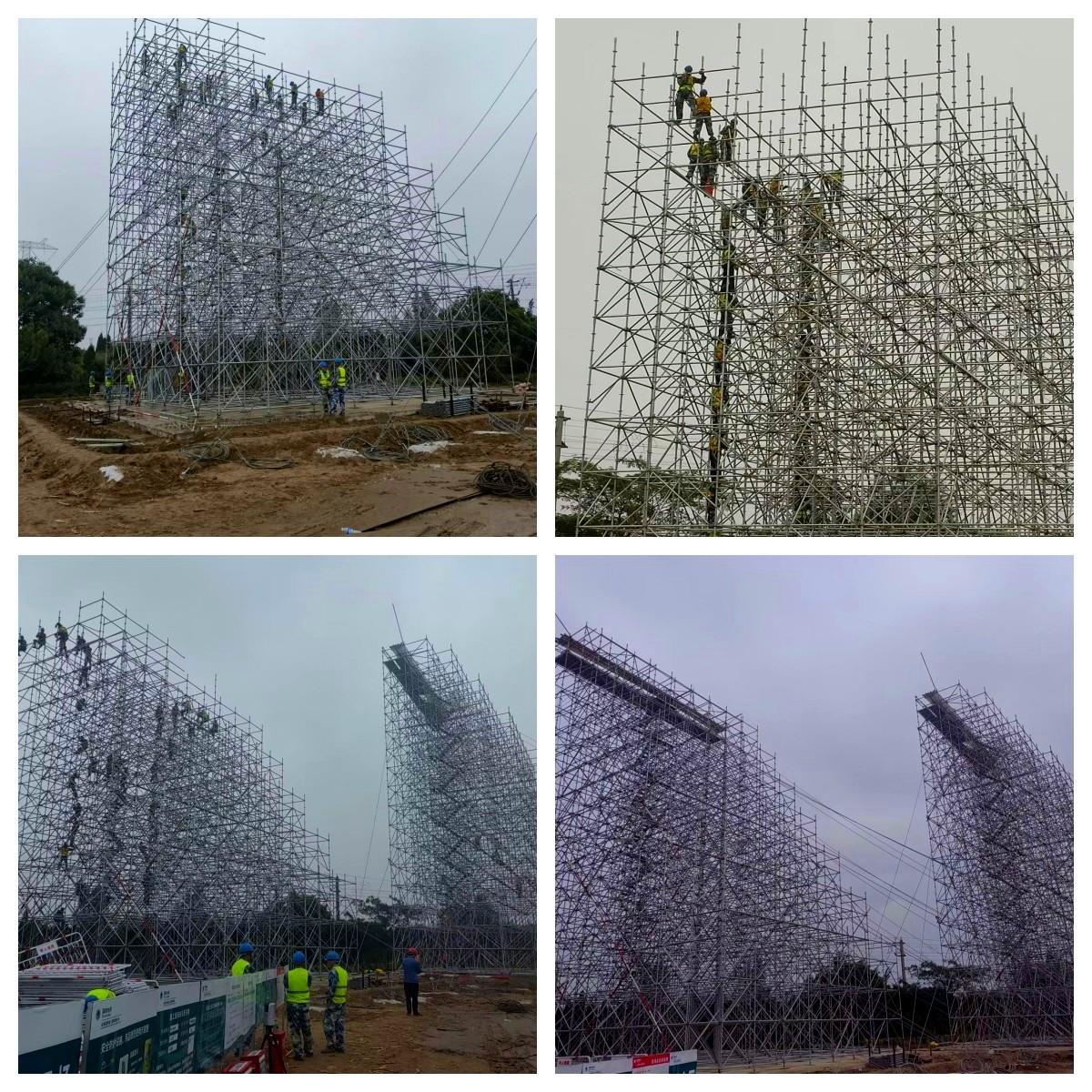 2、铁路两侧各搭设 2 组跨越架,跨越架尺寸:14.4m(长)×16.2m(宽)× 25.5m(高),每组跨越架封网由 5 根φ16 迪尼玛绳作为承力索,由 5 根φ12 迪尼玛绳作为拉网绳,铁路和自闭线上方均按照每排间隔 2m 的搭设方式进行封 网,铁路上方每组封顶网需 15m 绝缘杆 23 排;自闭线在栅栏内距离铁路较近, 封网时与铁路上方防护网共用 6 根绝缘杆,故自闭线上方每组封顶网需 15m 绝 缘杆 3 排,则本次封网共需 15m 绝缘杆 52 排。铁路两侧跨越架高度为 25.5m,长度(顺铁路方向)14.4m,宽度(顺电力 线方向)16.2m,跨越架尺寸:1-3 排高 25.5m,4 排高 22.5m,5 排高 19.5m,6 排高 16.5m,7 排高 13.5m,8 排高 10.5m,9 排高 7.5m,10 排高 4.5m跨越架 搭设要求:按《电力建设安全规程第 2 部分:电力线路》(DL5009.2-2013)要 求,选用承插型盘扣式跨越架,立杆间距为 1.8m,横杆间距为 1.5m。
